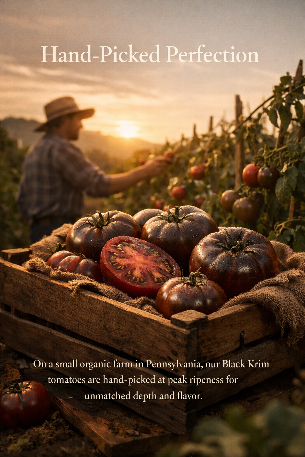 We source Black Krim tomatoes—prized for their deep color, natural sweetness, and savory intensity—from a small organic farm in Pennsylvania. Each one is hand-picked at peak ripeness, when flavor is at its fullest expression.