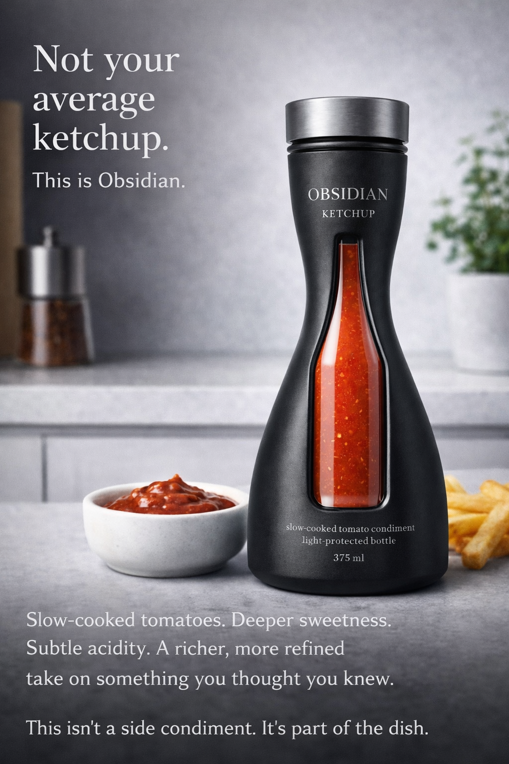 Obsidian ketchup is slow-cooked in small batches from organic, peak-season Black Krim tomatoes, selected for their depth, richness, and natural complexity. With over 20 tomatoes per bottle, Obsidian delivers a deep, rich tomato flavor with balanced sweetness and a clean, lingering finish.